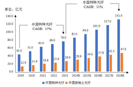 随着新智造、新基建等新质生产力的发展,我国特种光纤市场需求保持快速增长态势,市场规模不断扩大。相关数据显示,国内特种光纤市场规模从 2019 年的 43 亿元增长至 2023 年的 76 亿元,2028 年有望进一步攀升至 131 亿元。